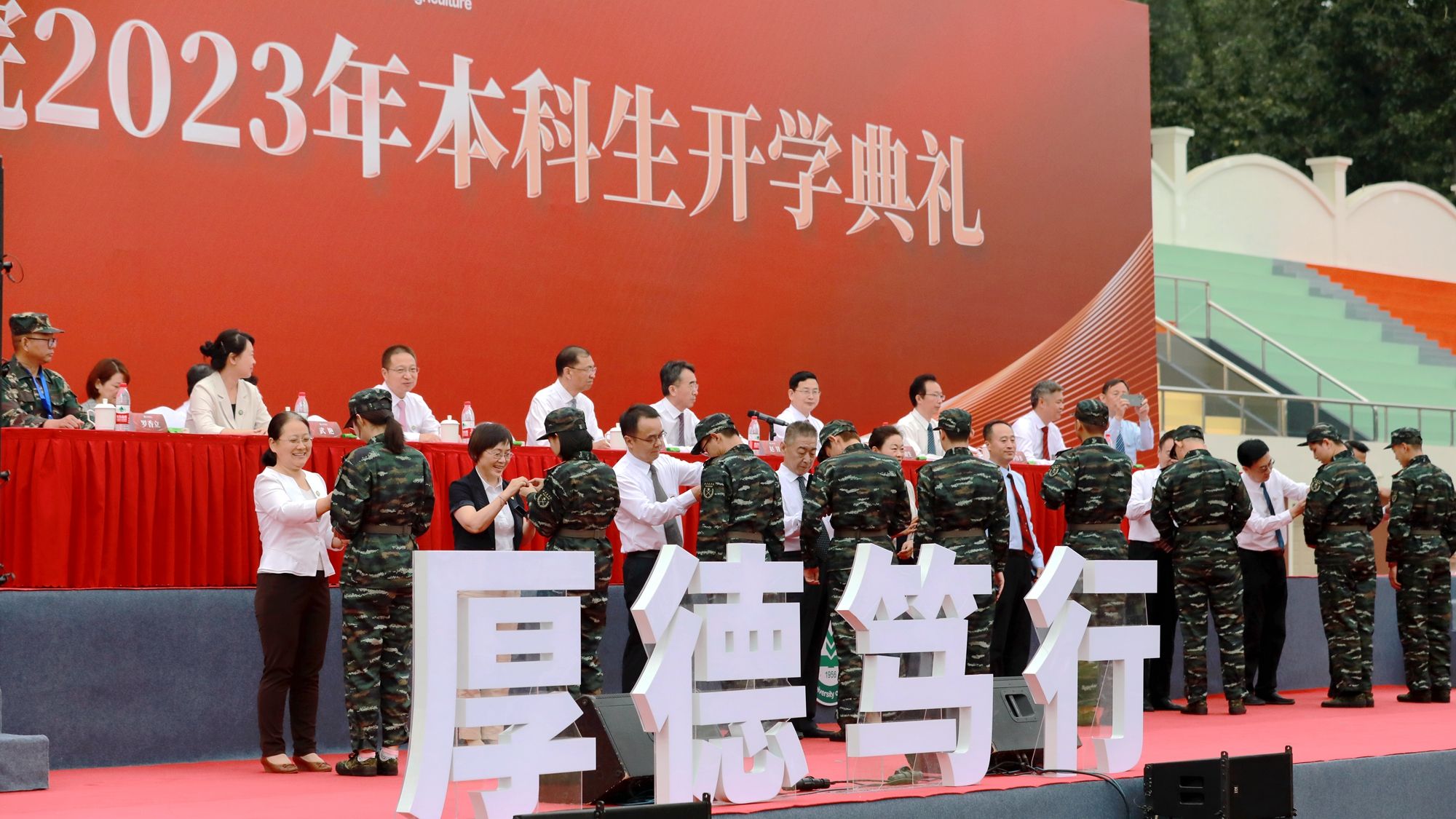 在全校上下深入学习贯彻党的二十大精神,喜迎学校第四次党代会胜利召开,凝心聚力建设都市农林特色高水平应用型大学之际,8月27日,学校2023年本科生开学典礼暨军训开营式隆重举行,广大师生共同见证1981名新同学加入北农大家庭、携手启航新程。校领导赵锋、段留生、仲丛生、李伟书、张德强、张劲柏、武艳,我校动科学院1981级优秀校友、沃德股份副董事长、峪口禽业党委书记周宝贵,军训团团长罗香立出席活动。开学典礼和军训开营式由党委书记赵锋主持。