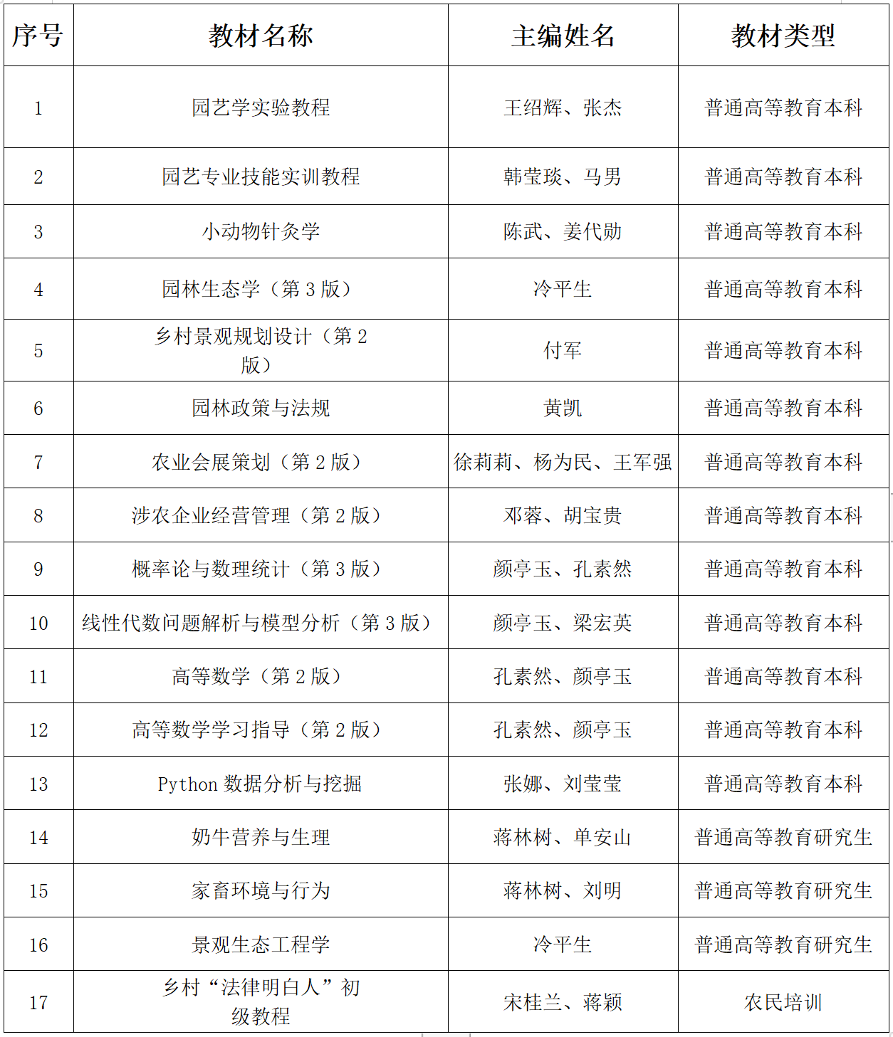 近日,农业农村部教材办公室发布《关于公布首批农业农村部“十四五”规划教材名单的通知》,我校共17部教材入选,其中13部普通高等教育本科教材,3部普通高等教育研究生教材,1部农民培训教材。