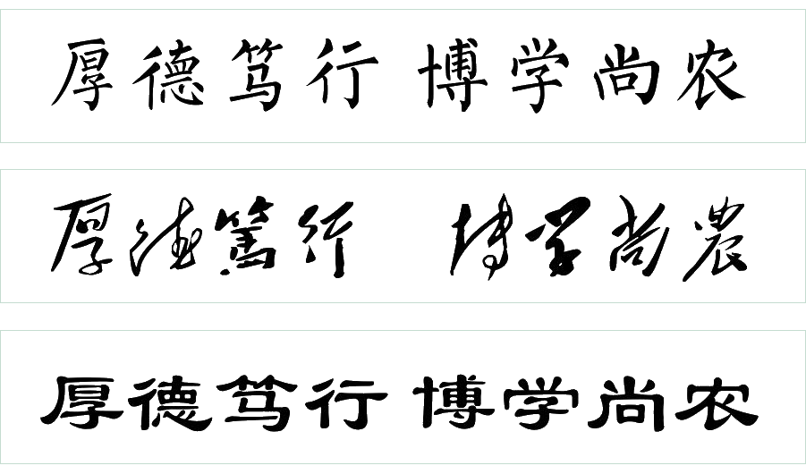 厚德笃行,意在强调学校“育人为本、德育为先”的教育理念,期望师生塑造高尚的道德品格,以德立身,注重实践,用以倡导尚德重行的育人精神。博学尚农,旨在突出学校“以农为本、博采众长”的教育思想,要求师生重视农业、关注“三农”,掌握广博知识,积淀深厚学问,用以培养宏达广识的爱农求知情怀。二者密切相联、相辅相成,充分体现了“德才兼备”与“知行合一”的全面要求和完整统一,与学校“以农为本、唯实求新”的办学理念和复合型应用型都市型现代农林人才的培养目标一脉相承。