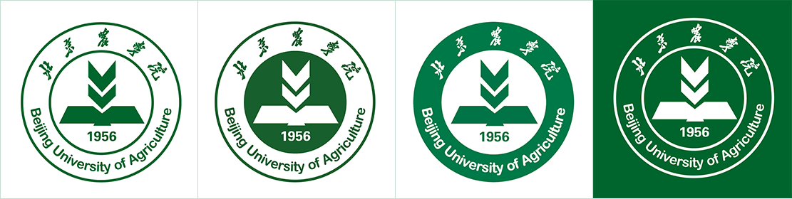 两圆环之间上半部分为学校中文毛体手书体名称,下半部分为英文校名 “Beijing University of Agriculture”,