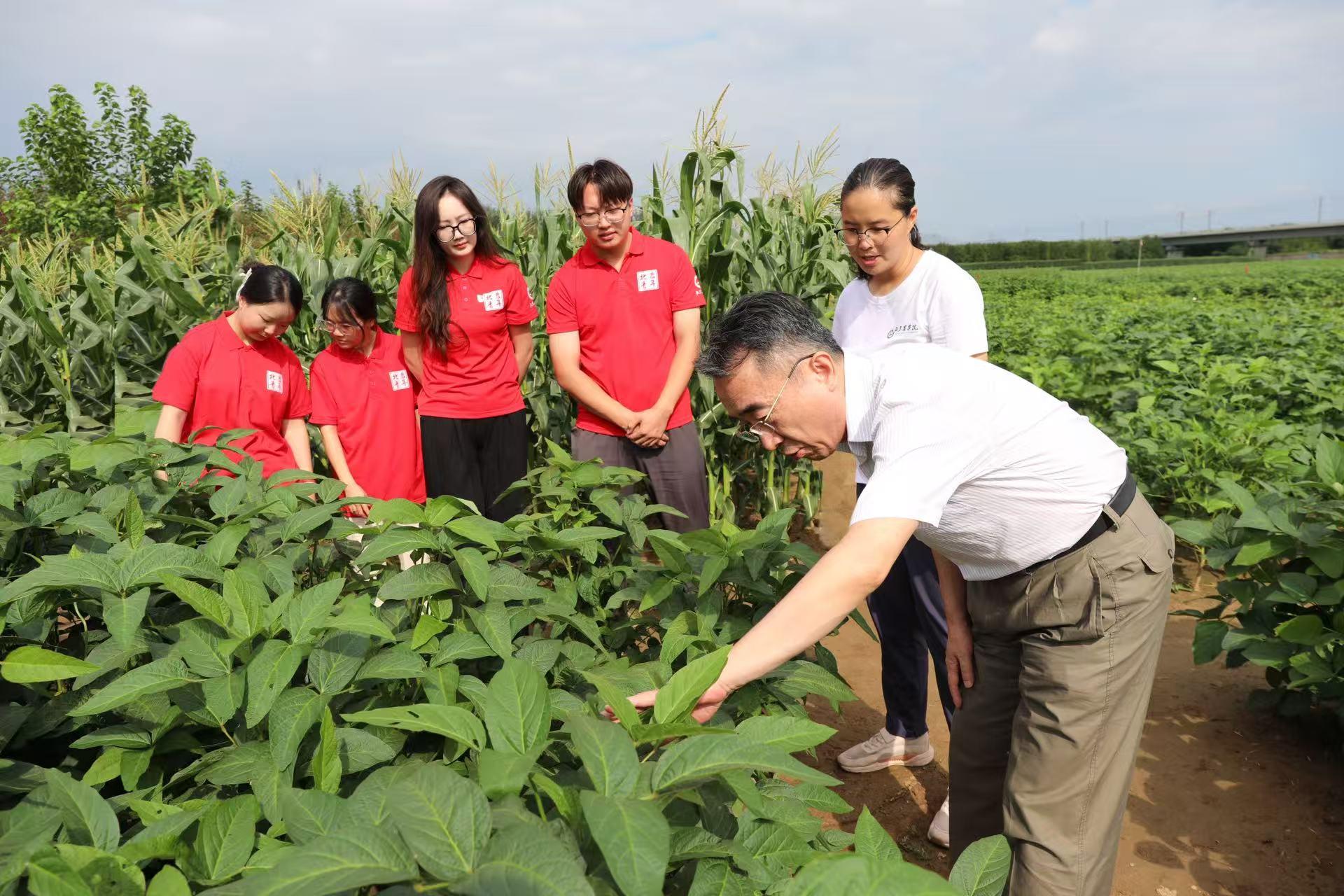 校领导一行走进田间地头,切身体验师生开展支农扶农社会实践活动取得的成果,深入了解大豆新品种培育情况与产学研结合进展及成效,勉励实践团师生厚植爱农情怀,练就兴农本领,在服务乡村振兴的生动实践中经风雨、长才干、做贡献,致力于解决“三农”领域卡脖子技术难题,努力把论文写在京华大地上、把成果凝结在农民收获里。希望广大师生积极发挥专业和技术优势,深入“三农”一线、田间地头开展指导和帮扶,有力有效促进农业灾后恢复生产。