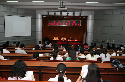 典礼在雄壮的国歌声中开幕。杜晓林副校长发表了讲话,他首先代表学校党委和行政对2009届专升本新生进入北京农学院进行本科学习表示衷心地祝贺和热烈地欢迎。他从学校历史、办学条件、教学科研、师资水平、国际合作等几个方面为专升本新生介绍了学校基本情况,他希望同学们能够深入了解学校、融入学校环境,能够在今后的学习中提高标准,严格要求自己,努力学习打好基础,争取获得新的更大的成绩。会上,杜晓林副校长为新生颁发了新生入学通知书及北京农学院学生手册。