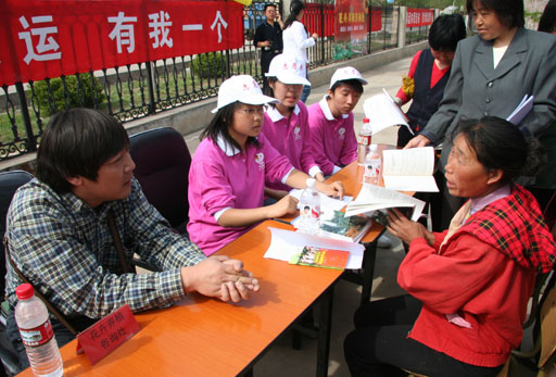志愿者为村民发放奥运知识宣传手册