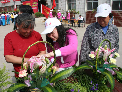 志愿者帮助村民学习插花技术