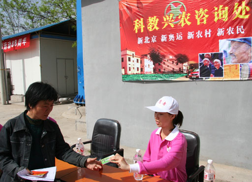 志愿者为村民发放科技兴农资料