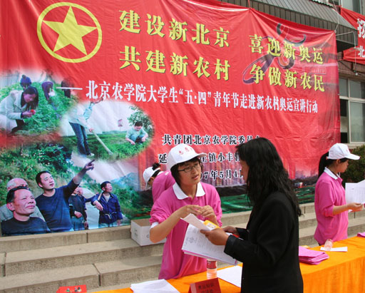 为弘扬五四精神,服务新农村建设,贡献北京奥运,在5月4日青年节来临之际,我校100名大学生志愿者走进延庆县康庄镇小丰营村开展了题为“建设新北京,喜迎新奥运,共建新农村,争做新农民”的奥运宣讲活动。北京市委教育工委奥运工作办公室主任闫成、副主任张琴,康庄镇党委副书记贺利、我校院长王有年、党委副书记王晓霞出席了本次活动。