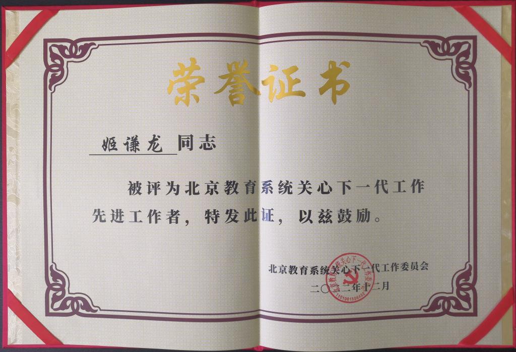 我校研究生教学督导组获评“北京教育系统关心下一代工作先进集体”,退休教师陈学珍和姬谦龙获评“北京教育系统关心下一代工作先进工作者”。