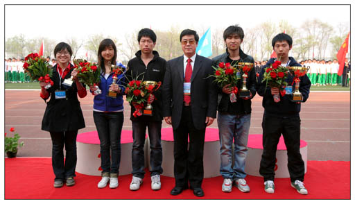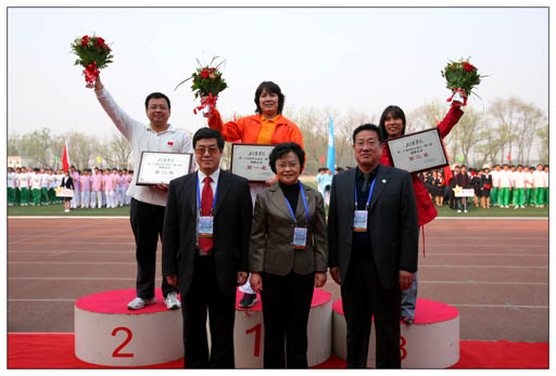 党委书记王慧敏、校长王有年、校党委副书记高东为学生组运动成绩男、女团体总分前三名获奖单位颁奖。