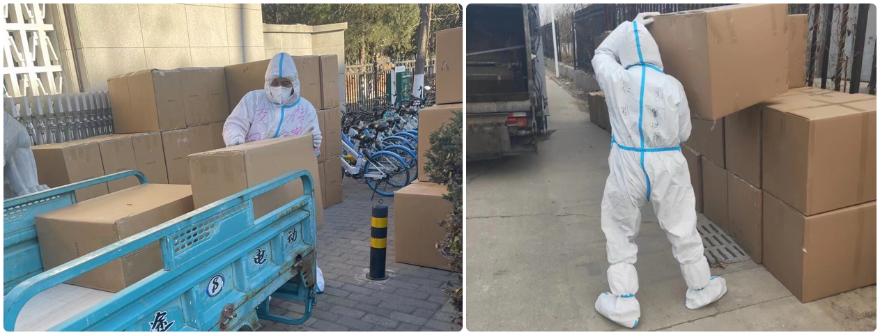 管理岗三名职工,第一时间参加了后勤的物资配送队,向各楼宇运送各种防疫物资。
