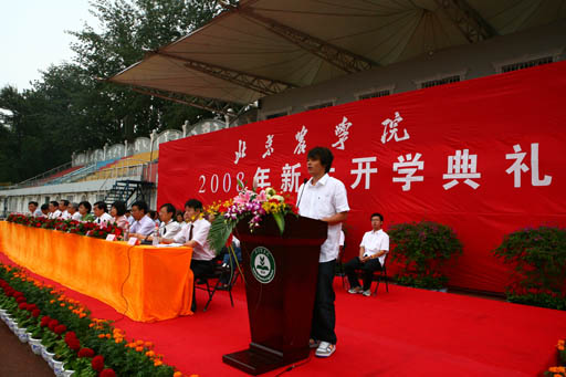 9月的北农,秋意浓浓。7日下午,嘹亮的代校歌《绿色的希望》在运动场上空回荡。16:30,我校2008级本专科新生开学典礼在运动场隆重举行,学校领导王慧敏、王有年、罗维忠、王晓霞、杜晓林、姚允聪、朱生利出席典礼并在主席台前排就坐。