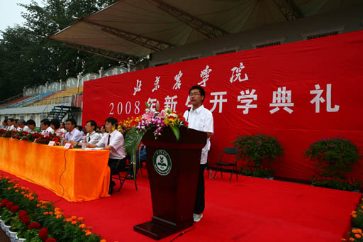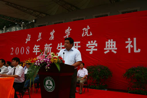 在热烈的掌声中,院长王有年教授发表了热情洋溢的讲话。他首先代表学校全体师生员工对1900余名本专科新生在举国欢庆奥运的时刻来到北京农学院表示热烈的欢迎。随后,他指出,衡量一所学校的标准包括招生第一志愿的录取率,毕业生的就业率和社会对学校的满意率等。我校近年招生第一志愿录取率达90%以上,今年文科第一志愿录取率更是达到了100%,毕业生的就业率达到95%以上,社会对毕业生满意率也达94.6%,学校越来越得到社会的认可与关注。