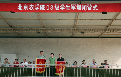 7月10日上午8:30,我校2008级学生军训闭营仪式在怀柔区群英昊军训基地举行,北京市学生军训办公室主任教授级大校张培松、党委书记王慧敏、党委副书记高东、纪委书记朱生利、党政办公室、宣传部、教务处、学生处以及各系领导出席闭营仪式,闭营仪式由学生处副处长张国柱主持。