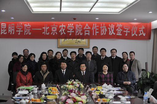 18日下午,我校与昆明学院合作协议签字仪式在昆明学院办公楼311会议室隆重举行。签字仪式由昆明学院副校长熊晶主持。在双方各自介绍学校基本情况后,王校长进一步介绍了北京都市型现代农业发展和沟域经济,介绍了我校在都市型农业教育和研究方面的做法和经验,希望两校在师资培训、共同开展科研项目、师生交流、都市农业建设与发展研讨及借鉴等方面取得实效。