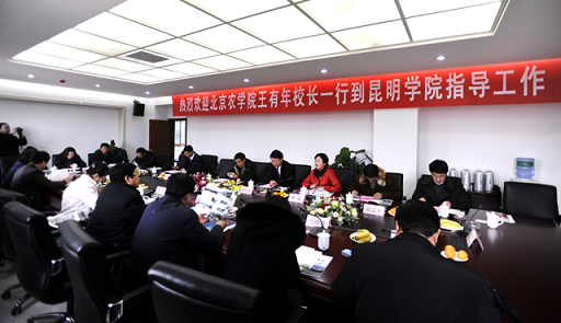 1月18-20日,校长王有年、党委副书记高东、副校长郑一淳一行8人考察了昆明学院。并与昆明学院签订发展都市型现代农业合作协议。在昆明学院校长陈世波、副校长熊晶的陪同下,校长王有年一行还参加了昆明市政府与昆明学院举办的都市型现代农业发展座谈会,参观考察了昆明晨农企业集团、云南农业大学、西南林业大学、昆明市石林县台湾农民创业园等地。