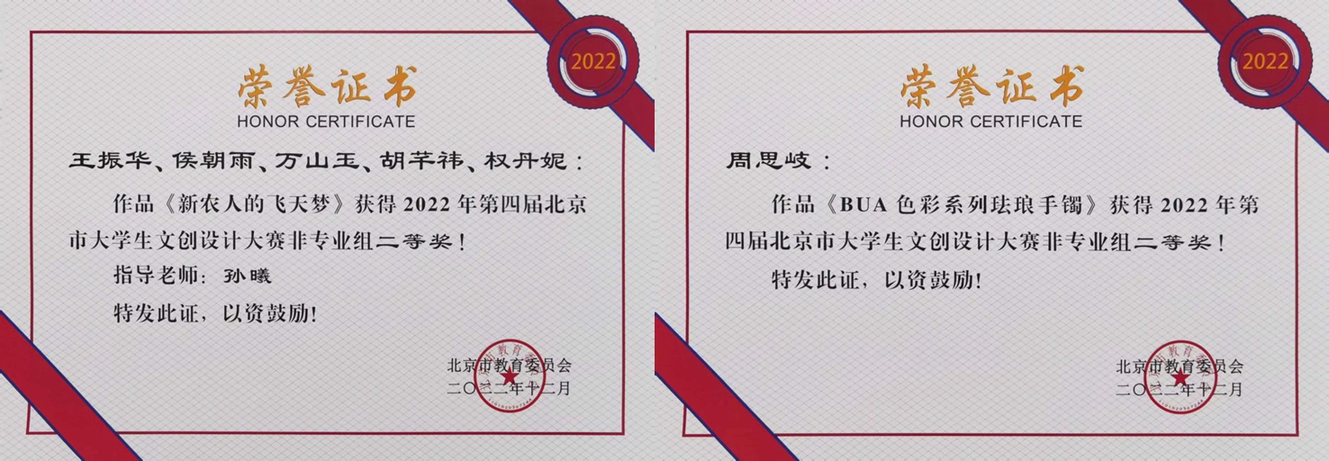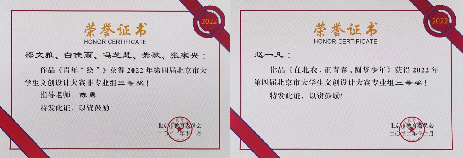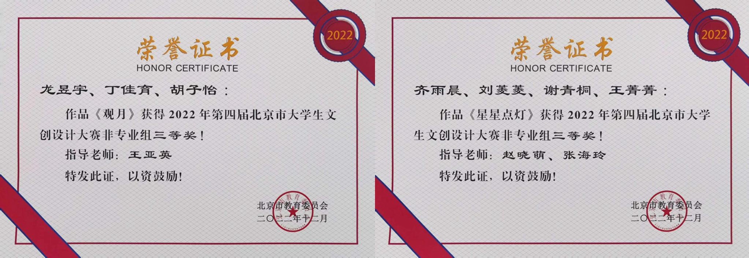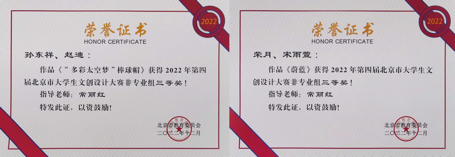 近日,北京市教委公布了2022年第四届北京市大学生文创设计大赛评选结果,我校获优秀组织奖,并获非专业组二等奖2项、三等奖5项、专业组三等奖1项的好成绩。