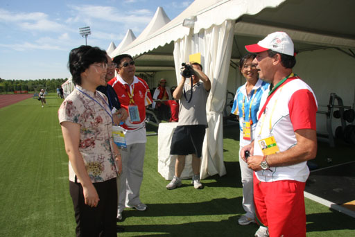 在路过准备活动场地的力量训练房时,学校领导与葡萄牙田径队的一位教练进行了亲切的交流。该教练表示,非常感谢中国政府为各国运动员提供了这样一个安静的训练场地,中华民族是一个非常伟大的民族。学校领导则对他们的到来表示热烈的欢迎,同时表示我们的志愿者将会尽全力为各国运动员提供服务。