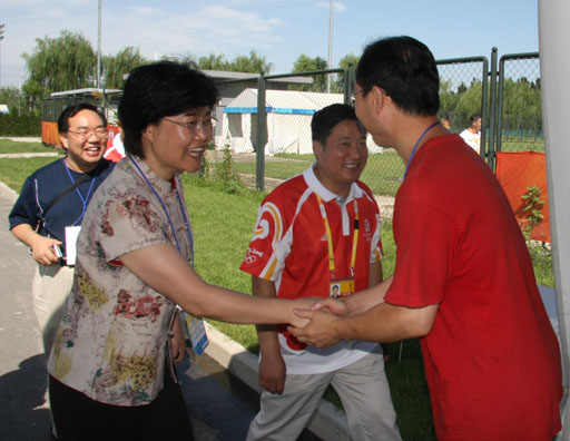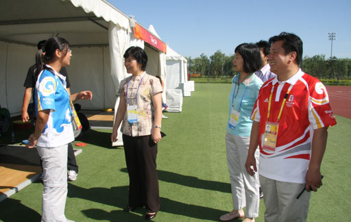 在朝阳体育中心,学校领导受到该中心副经理吴建华,书记高加梅的热情接待。两位中心负责人带领学校领导依次参观了朝阳体育中心的高尔夫球场、田径场、准备活动场地及投掷训练场。每到一个场地,学校领导都亲切地与学校志愿者交流,仔细地向他们询问饮食、工作等方面的相关情况。