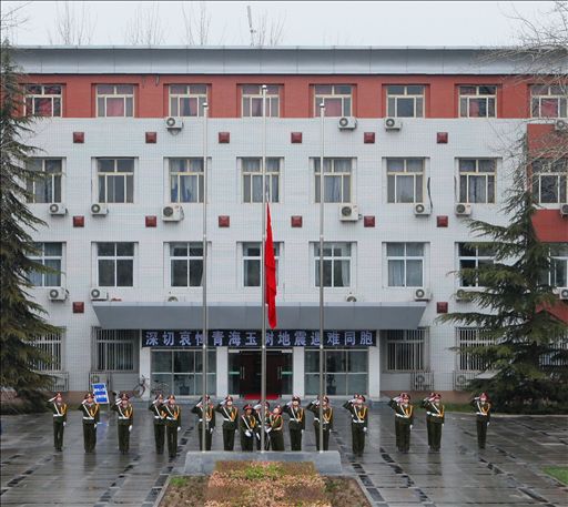 4月21日清晨6点40分,空中飘着冷风细雨。我校女子国旗班在行政楼门前举行升国旗仪式后,为青海玉树地震遇难同胞下半旗志哀。