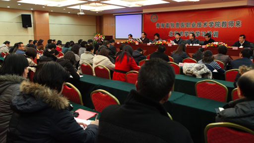 1月5日上午,青海畜牧兽医职业技术学院教师学习培训班开班典礼在北农科技交流中心隆重举行,32名教师将在我校进行为期2周的学习交流。北京市教委委员叶茂林,青海畜牧兽医职业技术学院院长杨予海,我校党委书记王慧敏,校长王有年,校长助理、教务处处长范双喜,党政办公室主任华玉武出席典礼。