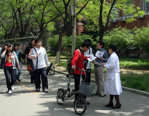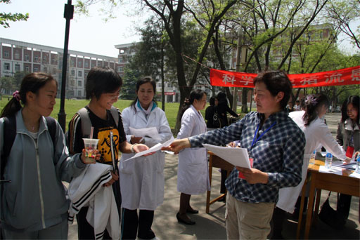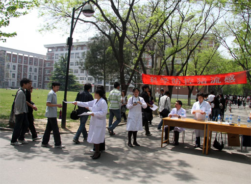 4月30日,校医院与动物科学系的八名专家组成宣传组,于我校人流密集的交叉路口设置宣传点,向来往师生员工分发宣传资料,宣传预防猪流感的相关知识,引导师生员工养成良好的卫生习惯。