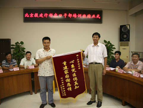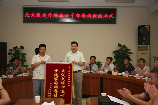 张烨锋、温发久代表学员发言。两位学员畅谈了自己的学习体会,并对北京市农工委、北京市园林绿化局、北京农业职业学院、北京农学院在培训期间给予他们的帮助表示感谢。他们表示一定要用实际行动为四川的灾后重建做出更大的贡献。为了表达感激之情,学员代表分别向北京市园林绿化局、北京农业职业学院和北京农学院赠送了锦旗。
