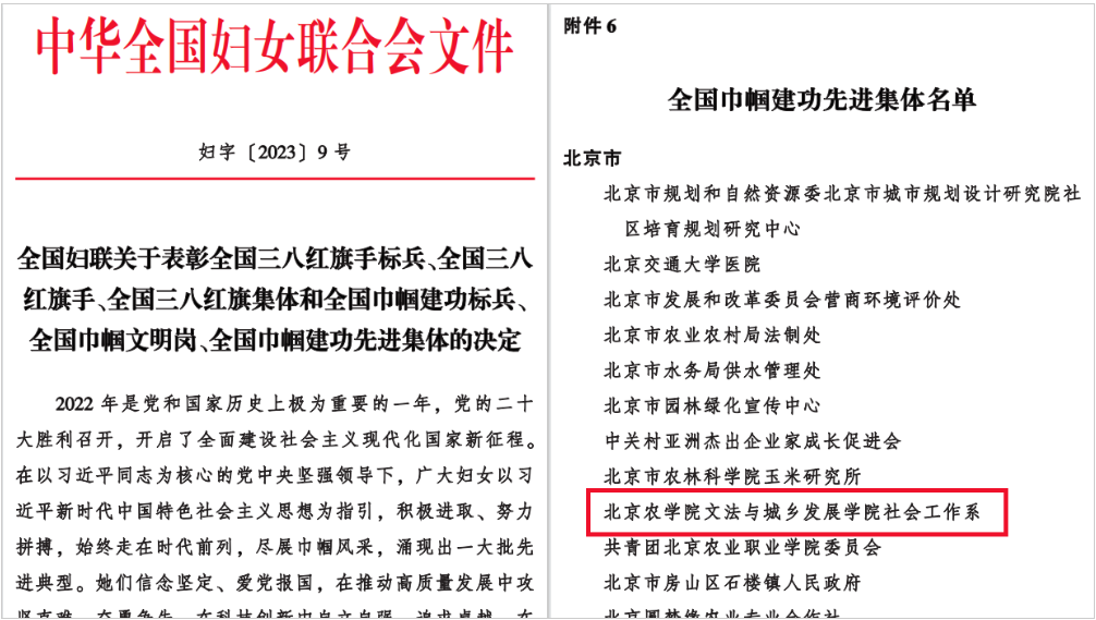 近日,全国妇联发布了《全国妇联关于表彰全国三八红旗手标兵、全国三八红旗手、全国三八红旗集体和全国巾帼建功标兵、全国巾帼文明岗、全国巾帼建功先进集体的决定》,对获得全国三八红旗集体、全国三八红旗手标兵等系列荣誉称号的集体和个人进行了表彰。我校文法与城乡发展学院社会工作系获“全国巾帼建功先进集体”荣誉称号。