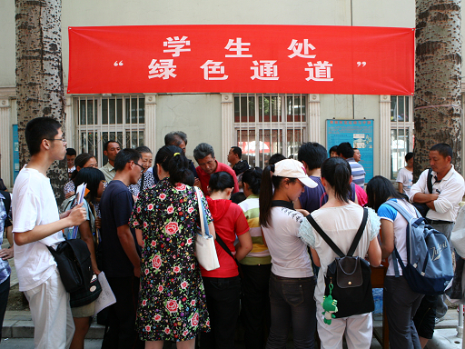 各院系登记注册的桌前人流不息,但学生处“绿色通道”的横幅下更是火爆,新生和家长手持通知书及各种证明,排成长龙,耐心地等待着。办公桌前,郭玉刚老师更是忙得不可开交,仔细浏览过新生的通知书和贷款证明后,他一一签字确认。与此同时,郭老师还就家长对于助学贷款的有关问题进行解答。在采访中,郭老师表示,“绿色通道”是我校为保证那些无力支付学费的学子们顺利入学而开设的,旨在让所有学子能够顺利开始自己梦想中的大学生活。学校不会让任何一个有梦想的孩子失去求学的机会。