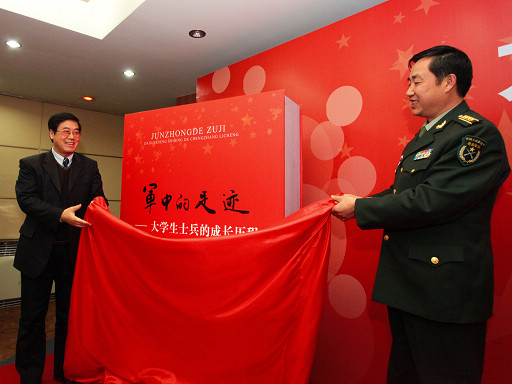 北京军区动员部副部长雷平大校、校长王有年为《军中的足迹》样书揭幕。