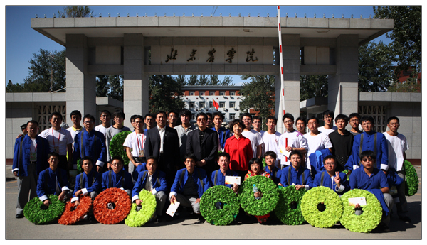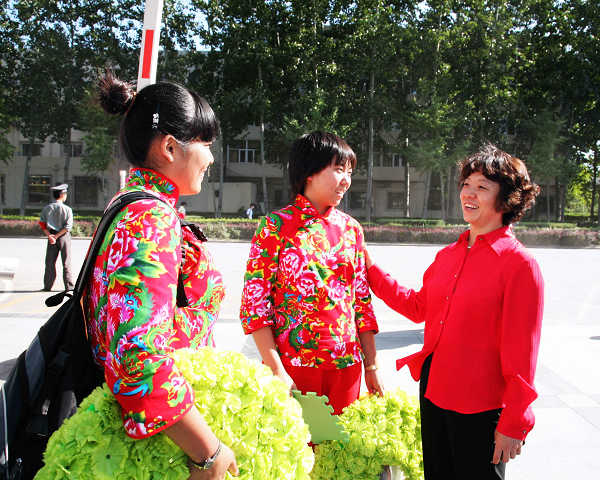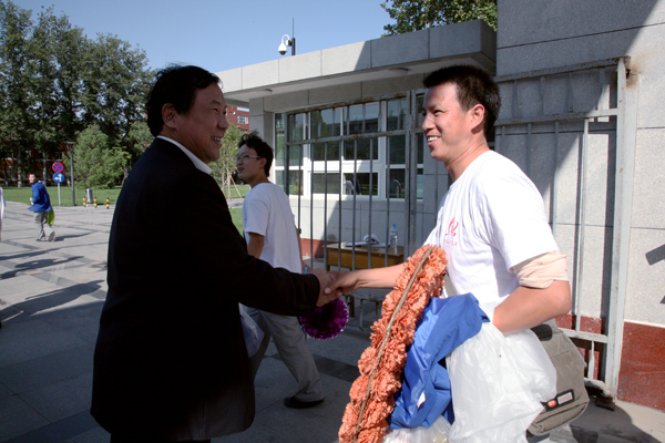 10月1日下午1时,我校参加国庆群众游行方阵师生圆满完成任务,胜利凯旋,校长王有年、党委副书记高东、副校长杜晓林亲自到校门外迎接。