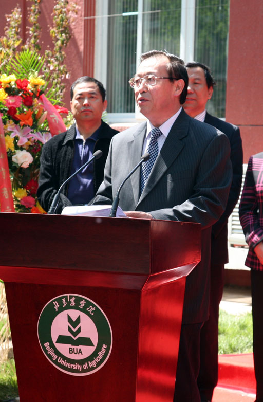 校长王有年代表学校全体师生员工对参加揭牌仪式的各位领导表示热烈的欢迎!对长期以来大力支持我校发展与建设的各级领导表示衷心的感谢!仪式上,他阐述了我校办学特色与任务,表达了我校办好北京都市农业研究院的决心。