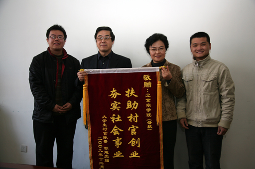 陈墨在敬献锦旗时说,从我毕业后担任起村官工作到后来开展食用菌创业,两年来,母校给予了我大力的支持和帮助,校领导更是像家长一样地关心我们的成长,曾多次到到试验基地参观调研,实地考察,帮助我们解决实际中的困难。没有母校就没有我们的今天,母校就是我们智力资源和社会资源的依靠,是我们带领村民致富的坚实支持者。为母校献锦旗,一方面是要感谢母校一直以来对我们的帮助,另一方面是想请母校放心,我们一定会认真落实母校对我们大学生村官的要求,在农村这片热土上,立身农村,服务农民,奉献社会,不怕苦,不怕累,为建设社会主义新农村贡献自己的青春、智慧和力量!为北京农学院争光添彩。