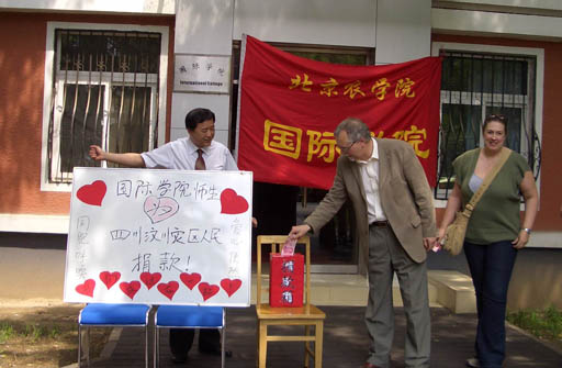 北京农学院国际学院-外语部的师生在获悉四川地震后,均积极为灾区筹款。在我校访问的哈勃亚当斯大学副校长Professor Brian Revell和专业负责人Sandra Turner亦捐款给了四川灾区, 希望以此表达对地球另一端灾害中人民的关心与哀悼。自然的力量人类无法阻挡,但是,大灾有大爱。面对灾难,无所谓天南海北,我们彼此拥有,互相扶持。我们拥有无穷的信心和决心,相信最终一定可以战胜一切。灾区的同胞们,你们永不独行!