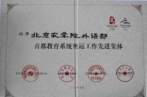 近日,我校外语部被中共北京市委教育工作委员会、北京市教育委员会、共青团北京市委员会、北京市学生联合会授予“首都教育系统奥运工作先进集体”荣誉称号。