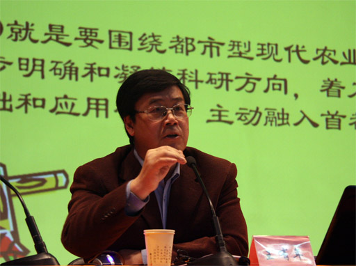 王有年从建设“人文北京、科技北京、绿色北京”、都市型现代农业发展、首都高等教育发展三个方面阐释了我校面临的机遇。