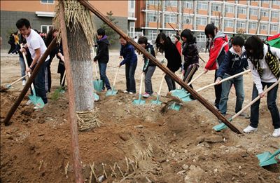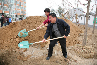 下午3点30分,校领导王慧敏、王有年、高东、高喜军、杜晓林、郑一淳、姚允聪、朱生利来到9号学生公寓楼前,与各学院师生代表一同植树,以表达对青海玉树遇难同胞的哀悼,用实际行动爱护我们的绿色家园。