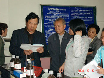 在检查中,校领导抽查了实验员的实验准备,仔细检查了实验教师的上课情况,观看了学生的实验操作,认真检查了学生的实验预习报告、实验报告及实验指导书的使用情况。