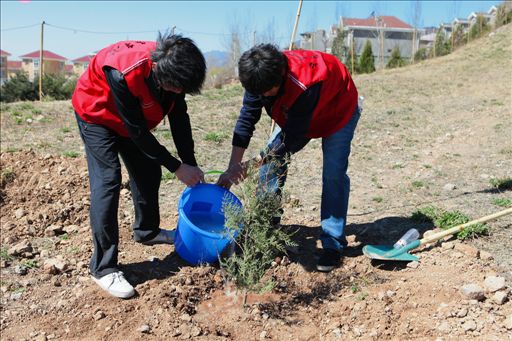 志愿者们在园林学院的李月华老师的示范下将80棵油松、侧柏载至土壤中,为其填土、浇水,看着亲手种植的成果,大家露出了笑容。