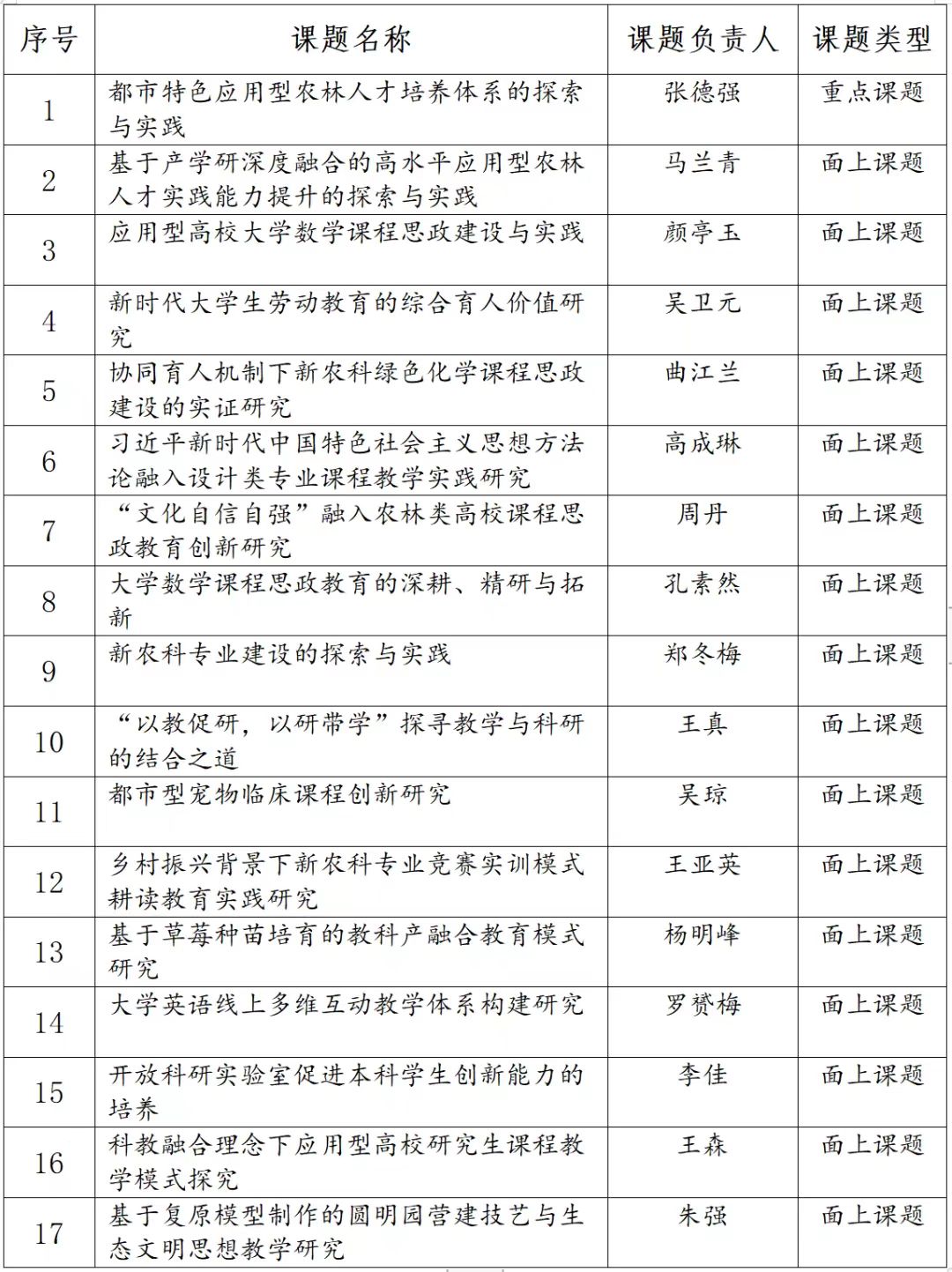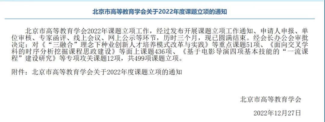 北京市高等教育学会2022年课题立项工作,经过发布开展课题立项工作通知、申请人申报、单位审核、专家函评、线上会议、网上公示等环节,最终我校共17项课题获批立项,占我校申报项目总数(35个)的50%,立项数是往年的3倍,其中《都市特色应用型农林人才培养体系的探索与实践》获批重点课题。