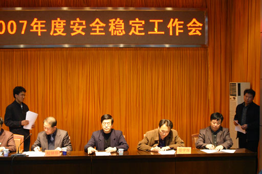 党委书记孙尧东、院长王有年与党政办、职业技术学院、后勤集团的党政负责人现场签定了2007年度安全稳定工作责任书(其它各处级单位将在会后签定)。