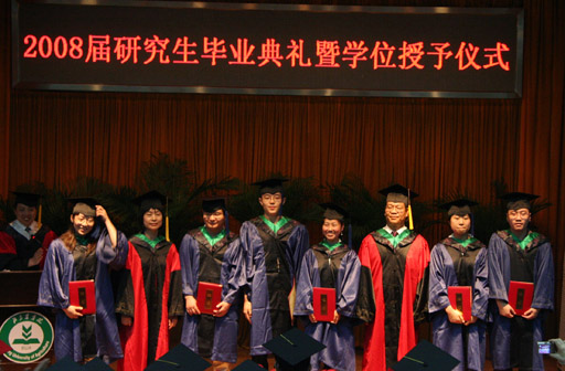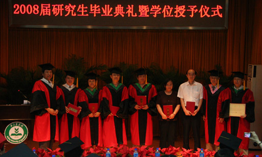 7月3日下午,我校2008届研究生毕业典礼暨学位授予仪式在小报告厅隆重举行。党委书记王慧敏,院长王有年,党委副书记罗维忠、王晓霞,副院长杜晓林、郑一淳、姚允聪,各系领导及导师代表出席典礼。毕业典礼在庄严的国歌声中拉开帷幕。研究生部主任张志勇主持典礼。