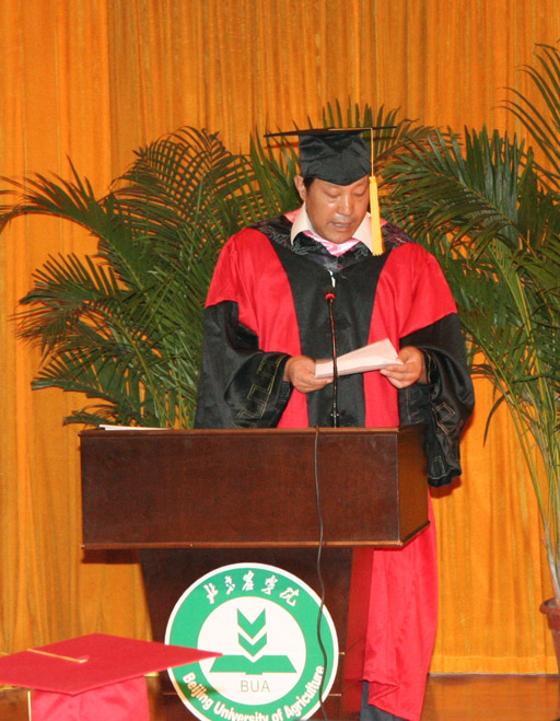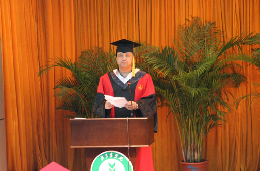 老师们表示衷心的感谢,向毕业研究生的父母、亲人们致以崇高的敬意。并向毕业研究生提出三点希望:第一、德字为本,卓越为先,将实现个人价值和社会价值有机地结合起来,自觉把个人的前途和命运与国家、民族的前途和命运紧紧地联系在一起;第二、终身学习,迎接挑战,在任何时候、任何环境中都要树立终身学习的观念,成为终身学习理念的实践者和传播者;第三、勇于创新,甘于奉献,以更大的冲劲、闯劲和韧劲,争做创新的排头兵,在甘于奉献的过程中印证自己的人身价值和社会价值。