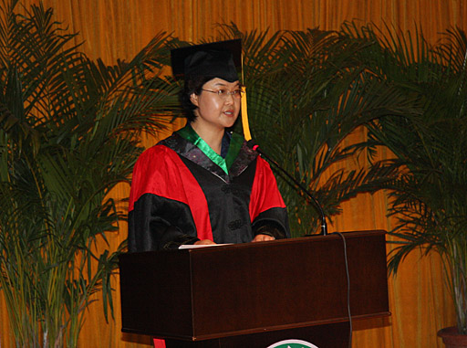 研究生部副主任胡宝贵在典礼上宣读“关于2008届研究生优秀学位论文评选结果的通知”和“关于2008届优秀研究生毕业生评选结果的通知”。李依林等8名研究生的论文被评选为校级研究生优秀学位论文,梁为等3名研究生被评为校级优秀毕业研究生。