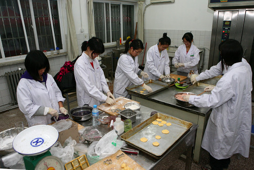 “揉面,铺平,浇黄油”,来自我校食品科学学院的学生们正在反复地进行着这个操作。不管是打鸡蛋清,煮豆浆,还是糅橘子渣,装烤箱,他们的动作都十分娴熟。