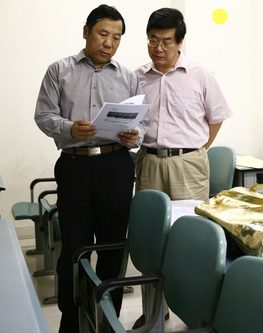 院长王有年、副院长杜晓林仔细阅读毕业生论文