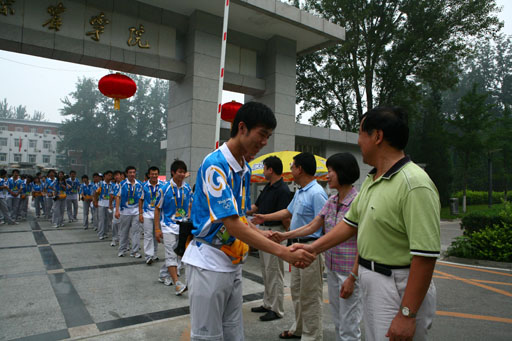 8月8号早上8时,在距第29届北京奥林匹克运动会开幕式还有12时8分之际,我校党委副书记王晓霞,副院长杜晓林、姚允聪,学生处处长韩宝平,团委书记杨宝东一行5人热情地欢送了我校第29届北京奥林匹克运动会开幕式的看台指挥互动志愿者。