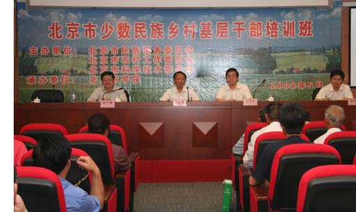 ,由市民委、市农委和市科委主办,我校承办的北京市少数民族乡村基层干部培训班在我校北农科技交流中心举行结业仪式。市民委主任申建军出席结业仪式并讲话,他对我校支持市民委开展科技培训和其他工作表示感谢,希望进一步加强双方的合作。院长王有年出席了培训班结业仪式。