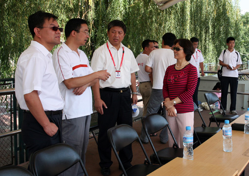 8月13日上午,国庆60周年群众游行活动第三分指副总指挥王有国、第三分指组织训练处处长刘文龙看望我校参训师生,并检阅了方阵训练情况。训练现场,党委副书记高东就训练相关问题与王有国、刘文龙进行探讨。
