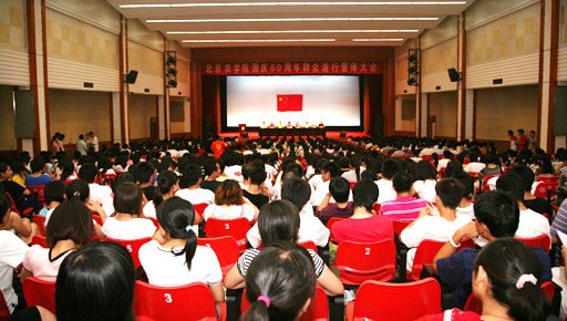 7月28日下午,我校在大礼堂召开国庆60周年群众游行誓师大会。我校党委书记王慧敏、党委副书记高东出席会议。参加国庆60周年群众游行活动的全体师生参加誓师大会。