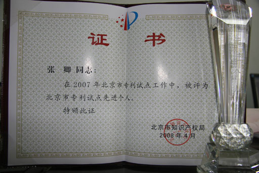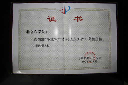 北京市和昌平区知识产权局的共同支持下,我校2007年度北京市专利试点工作成绩显著。经昌平区知识产权局推荐,北京市知识产权局评审,我校在2007年度北京市专利试点工作中成绩显著,考核合格。