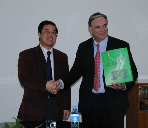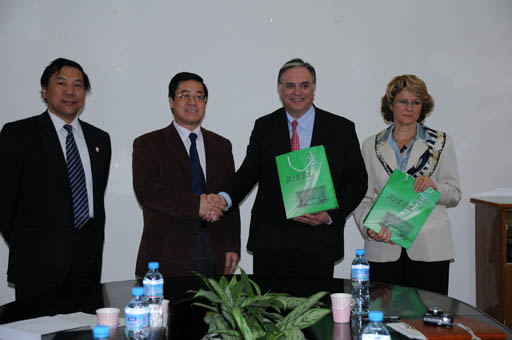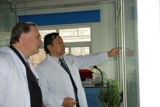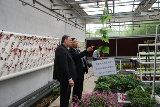 在杜晓林副校长的陪同下,Michel ROUX校长到组培中心参观。Michel ROUX校长饶有兴致地观看彩色甘薯、草莓脱毒培养,无土栽培设施,百合品种培育等。